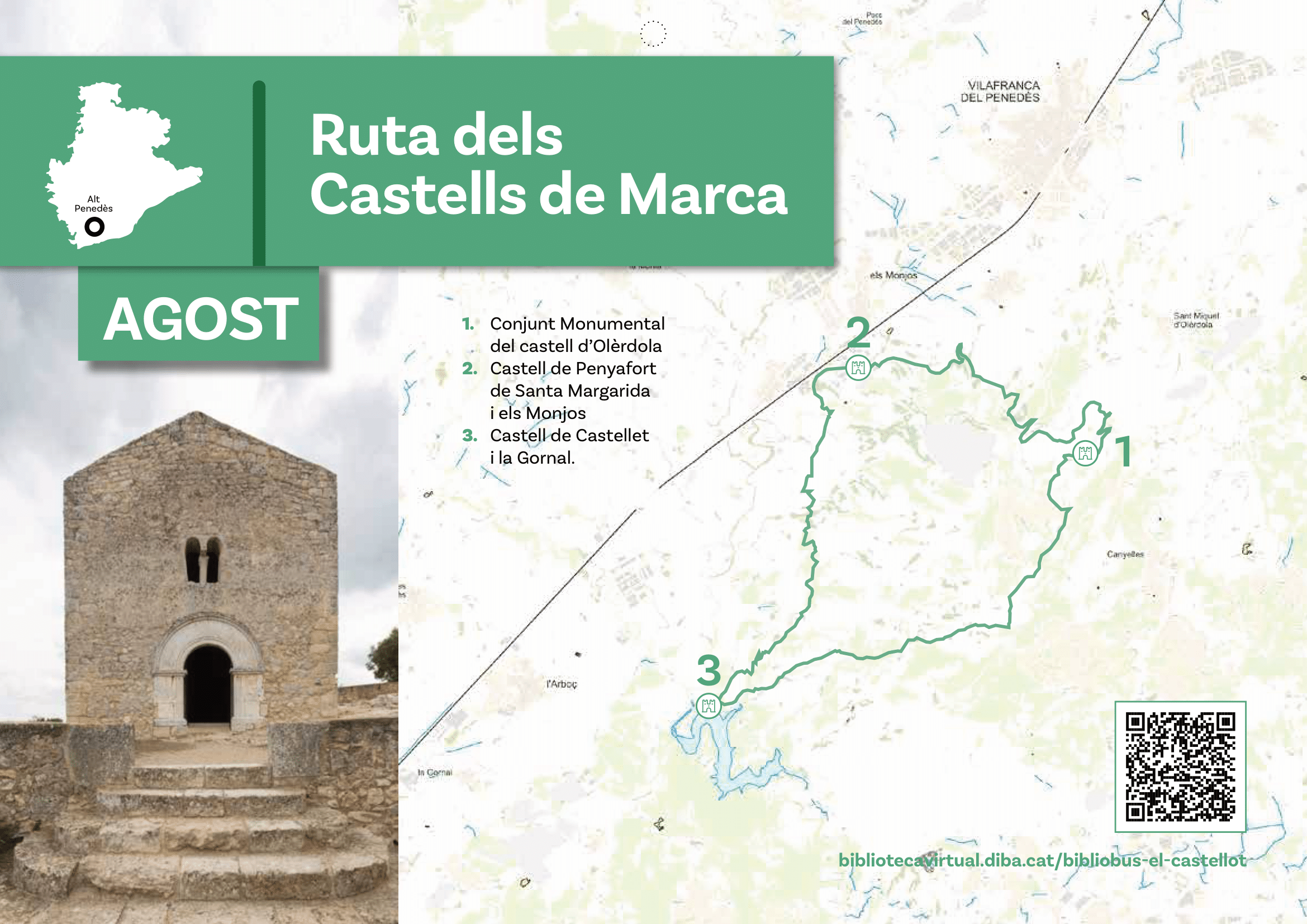 A cavall entre llegenda i patrimoni, aquesta ruta circular de 26,8 km ens transporta per tres castells d’origen medieval que marquen el territori i la seva memòria: el Castell de Penyafort, el Castell d’Olèrdola i el Castell de Castellet. El tram 2, de 10,4 km, entre Olèrdola i Castellet, transcorre pel GR 92 i GR 92-3, i és ideal per descobrir l’essència d’aquesta ruta en un sol dia.