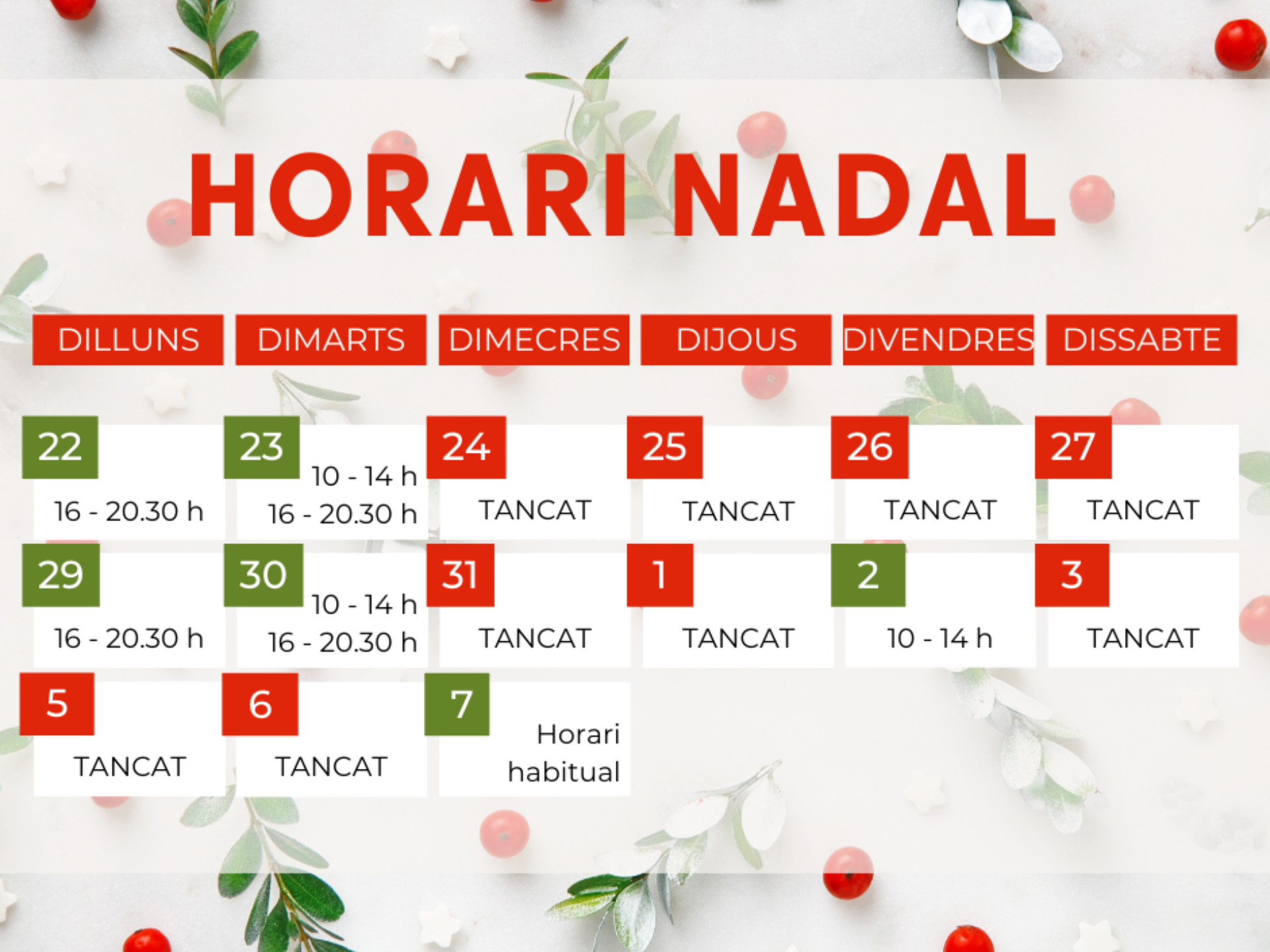 Horari especial de Nadal Dilluns 22 i 29: obert de 16 h a 20.30 h Dimarts 23 i 30: obert de 10 a 14 h i de 16 a 20.30 h Divendres 2: obert de 10 a 14 h