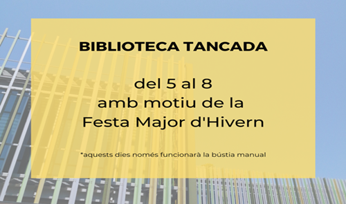 | L'horari d'hivern comença el dia: 12 de setembre Observacions de l'horari: La biblioteca romandrà tancada: 5, 6, 8, 24, 25, 26, 27, 31 de desembre; 1, 3, 5 i 6 de gener.