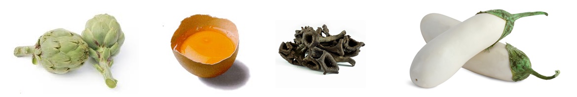 Per la elaboració de les carxofes i l' albergínia blanca : Traiem les fulles exteriors de la carxofa i la tallem de dalt a baix amb un ganivet el més fi possible. Per les albergínies, les netejàrem ben netes i les tallem amb un a ganivet el més fi possible. Ho fregim en oli calent fins que perdin tota l'aigua. Les posem sobre paper absorbent ,salem i reservem.
