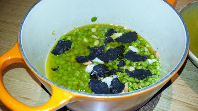 Posarem una mica d´oli i la nou de mantega en una cassola i farem coure els pèsols a foc suau uns deu minuts i hi afegirem els ceps ja remullats, la tripa de bacallà tallada a trossos i un got de l´aigua de bullir el bacallà una mica de sal i un rajolí d´oli i el deixarem una estona al foc i el remenarem de tant en tant, pararem el foc i finalment ratllarem la tòfona ratllada sobre els pèsols i servirem els plats.