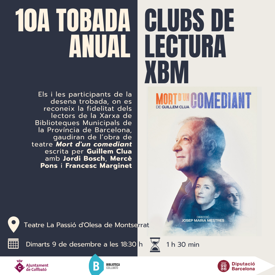 Els i les participants de la desena trobada, on es reconeix la fidelitat dels lectors de la Xarxa de Biblioteques Municipals de la Província de Barcelona, gaudiran de l’obra de teatre “Mort d'un comediant” escrita per Guillem Clua amb Jordi Bosch, Mercè Pons i Francesc Marginet.