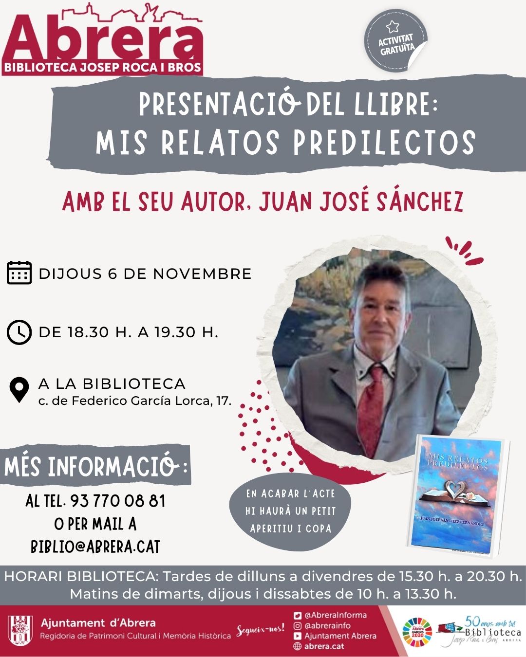 Dijous 6 de novembre, a les 18:30 h, a la Biblioteca Josep Roca i Bros, es farà la presentació del llibre: "Mis relatos predilectos", pel seu autor: Juan José Sánchez.