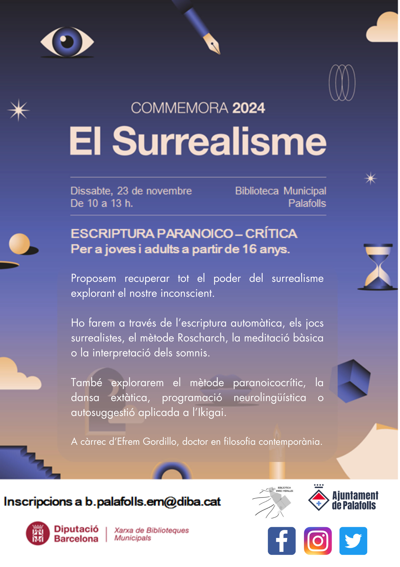 Aquest any 2024 es commemoren els 100 anys d'aquest moviment revolucionari i per aquest motiu hem organitzat aquest taller d'escriptura paranoico-crítica on lluny de la banalització en què ha caigut el terme "surrealisme" en els darrers temps, proposem recuperar tot el seu poder d'autoconeixement i plenitud vital donant algunes nocions bàsiques, perquè puguem explorar el nostre inconscient. Ho farem a través de pràctiques clàssiques com l'escriptura automàtica, la figuració surrealista, els jocs surrealistes, el mètode Roscharch, la meditació bàsica o la interpretació dels somnis. Però també explorarem nocions menys conegudes com el mètode paranoicocrítics, cledalisme, teatre artaudià, dansa extàtica, Seitai, programació neurolingüística o autosuggestió aplicada a l'Ikigai.