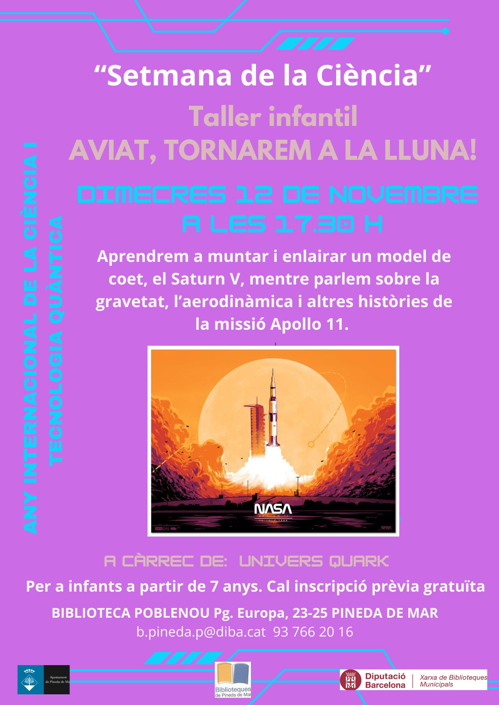 En aquest taller aprendrem a muntar i enlairar un model de coet, el Saturn V,  mentre parlem sobre la gravetat, l’aerodinàmica i altres històries de la missió Apollo 11.