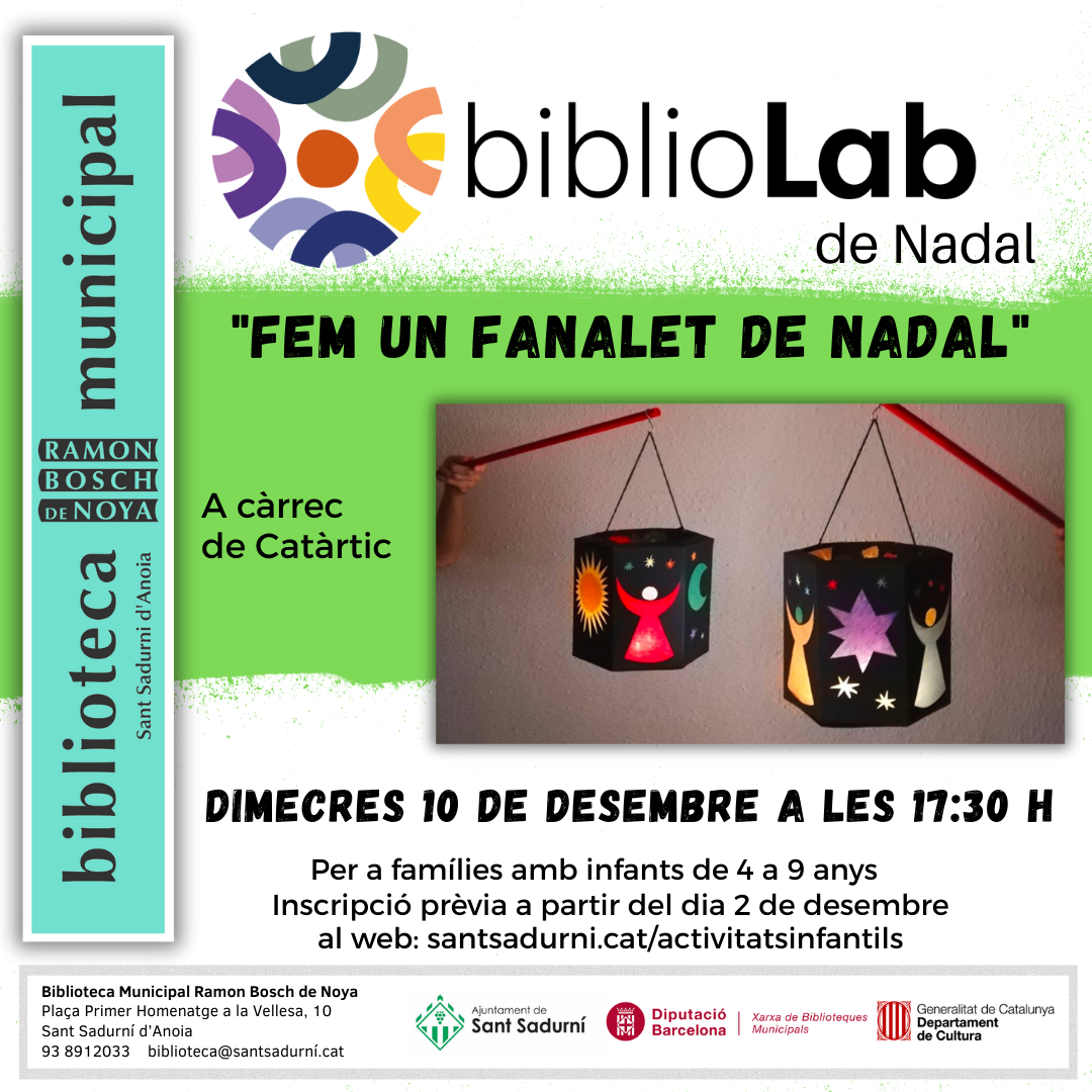 BiblioLab de Nadal "Fem un fanalet de Nadal" a càrrec de Catàrtic Per a famílies amb infants de 4 a 9 anys. Inscripció prèvia a partir del dia 2 de desembre