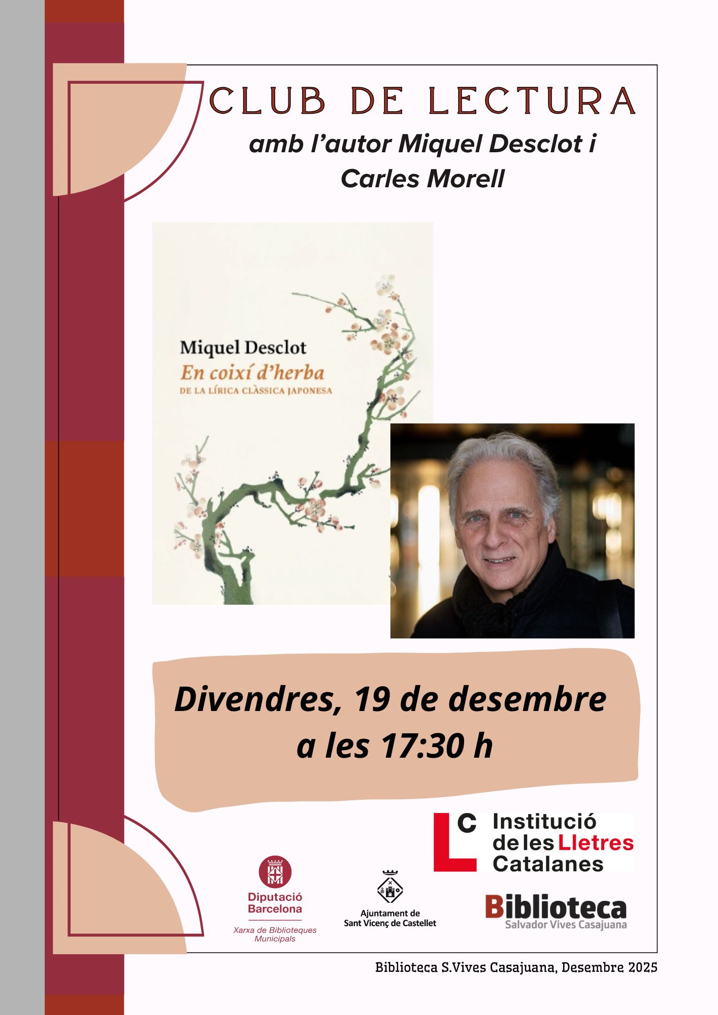 Darrera trobada de l'any del club de lectura de novel·la conduït per en Carles Morell; en conversa amb l'autor Miquel Desclot arran de l'antologia de poesia japonesa "En coixí d'herba", ampliació de la premiada "Per tot coixí les herbes" que celebra enguany trenta anys des de la seva primera edició i que fins el dia d'avui constituïa l'única antologia de poesia clàssica japonesa en català.