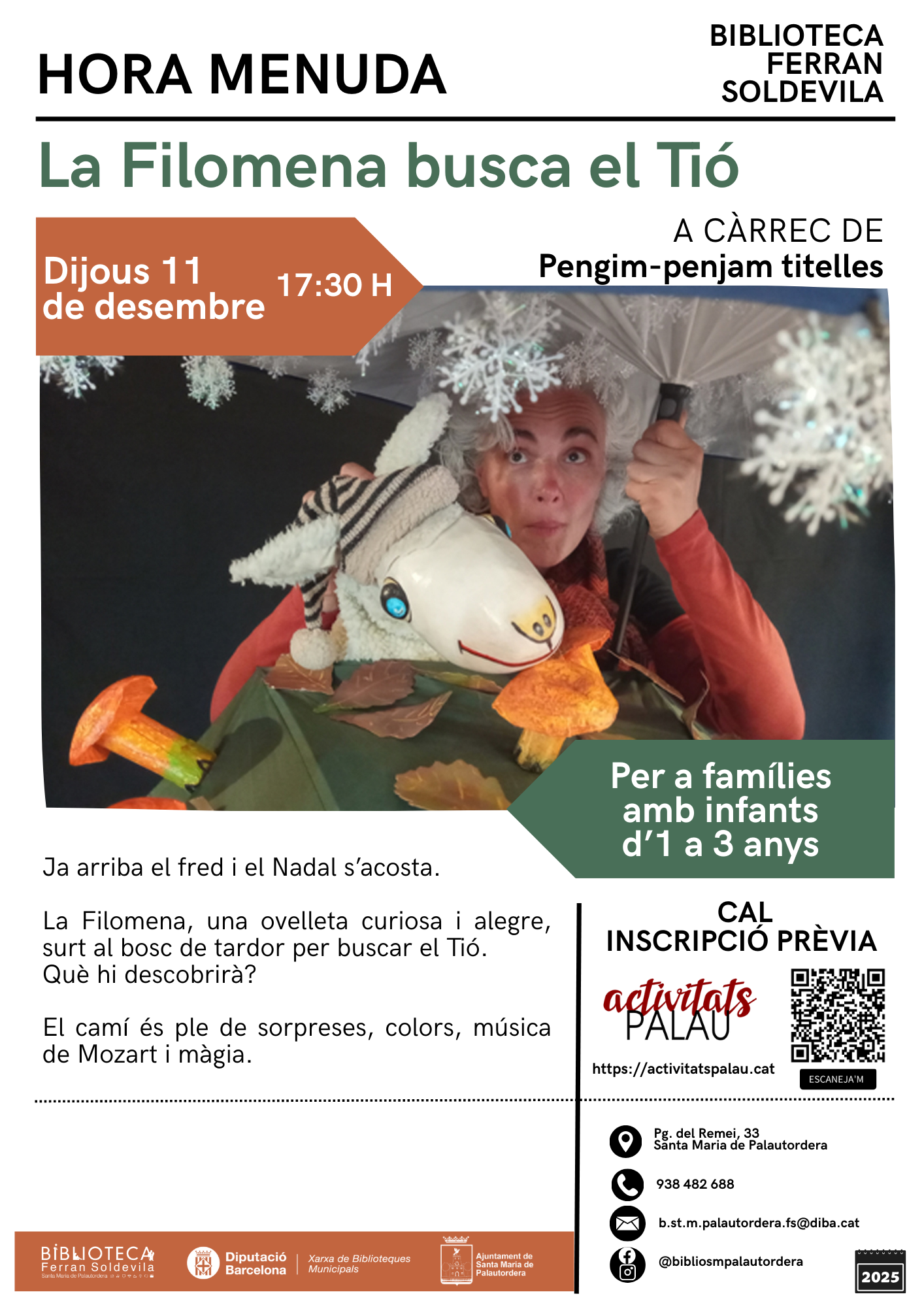 Ja arriba el fred i el Nadal s’acosta. La Filomena, una ovelleta curiosa i alegre, surt al bosc de tardor per buscar el Tió. Què hi descobrirà? El camí és ple de sorpreses, colors, música de Mozart i màgia. Amb la complicitat de la Mercè, la titellaire, viurem una aventura tendra i emocionant que encantarà petits i grans.
