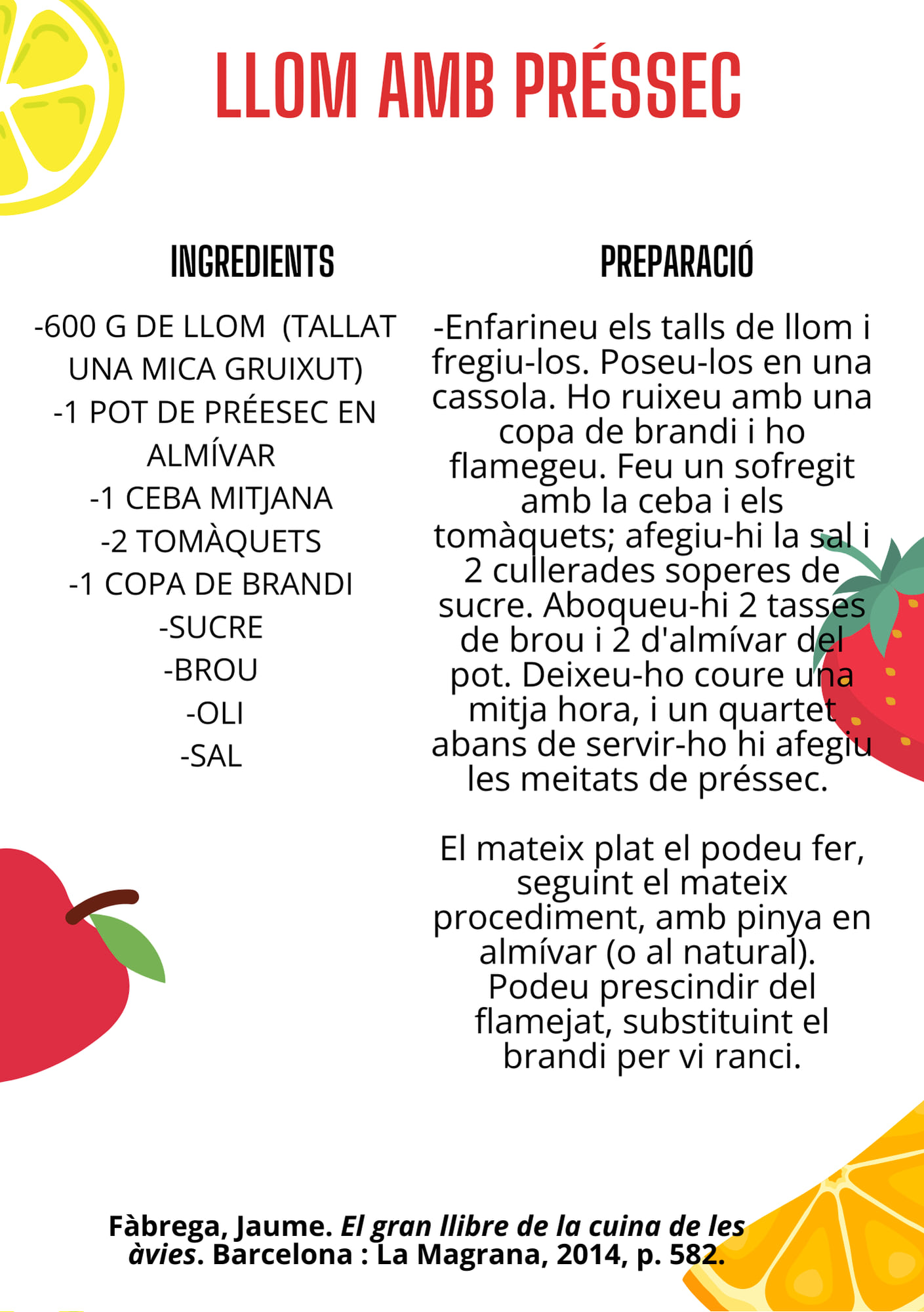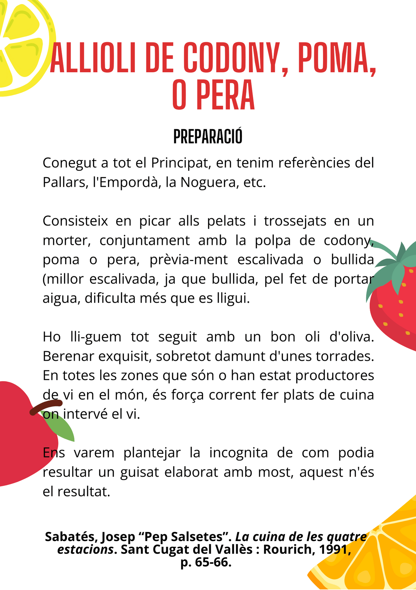RECEPTES RECOMANADES: conill guisat amb prunes fresques (pàg. 52), espatlla de porc amb pomes (pàg. 53), pollastre amb préssecs (pàg. 54), allioli de codony, poma, pera… (pàg. 65), fetge amb figues fresques (pàg. 67) i peus de porc rostits amb codony (pag. 78).