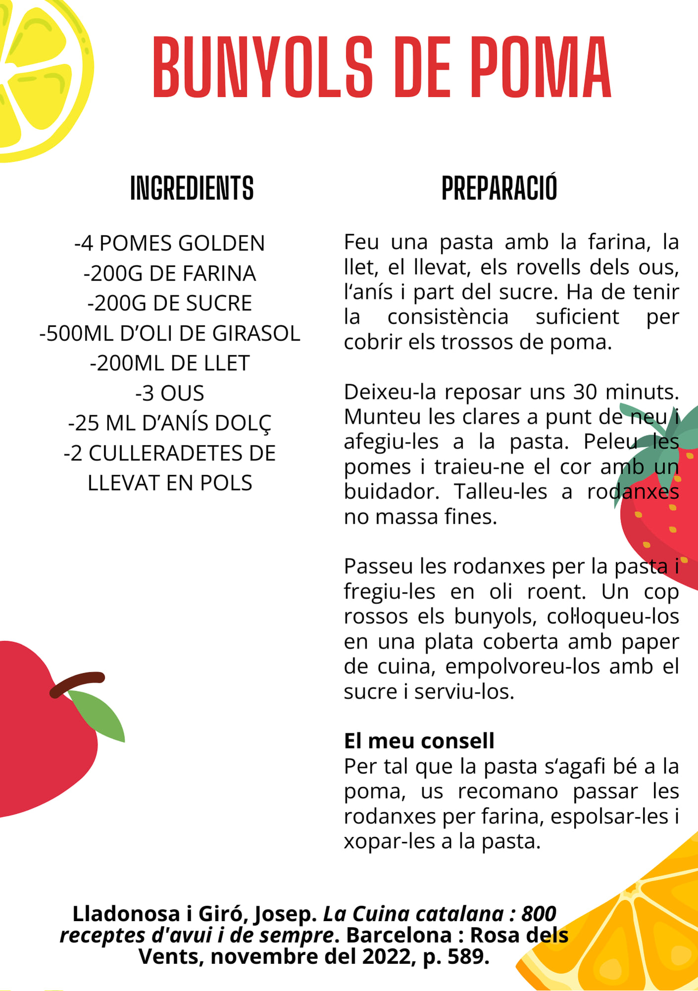 RECEPTES RECOMANADES: postres amb fruites com els bunyols de poma (pàg. 589), pomes farcides amb crema (pàg. 603).