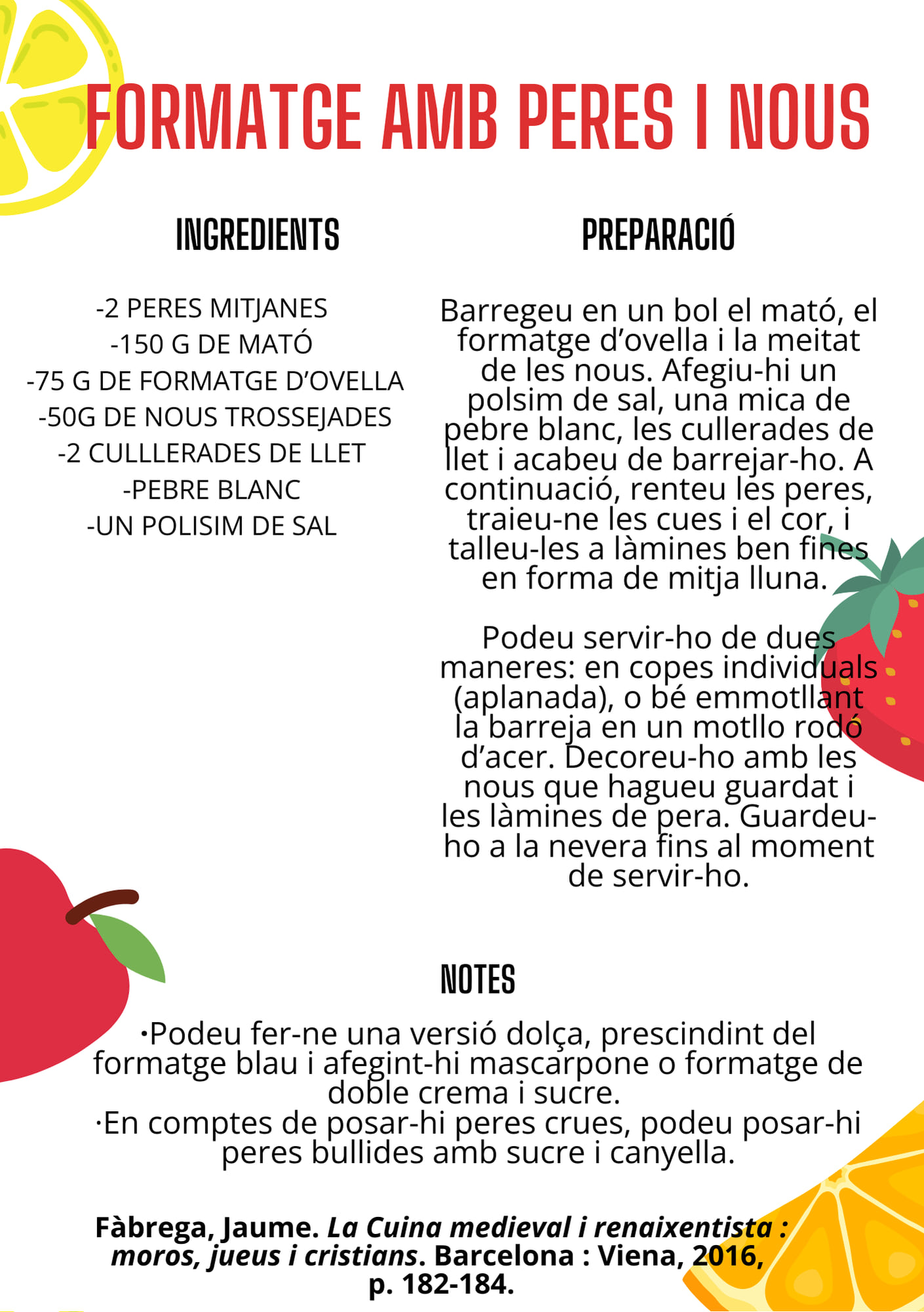 Un llibre molt interessant amb el qual podreu aprendre a cuinar fruites, on trobareu una descripció de les diferents fruites per preparar en receptes tan salades com dolces. A més a més, us ofereix una mirada al passat medieval i la importància del seu ús.