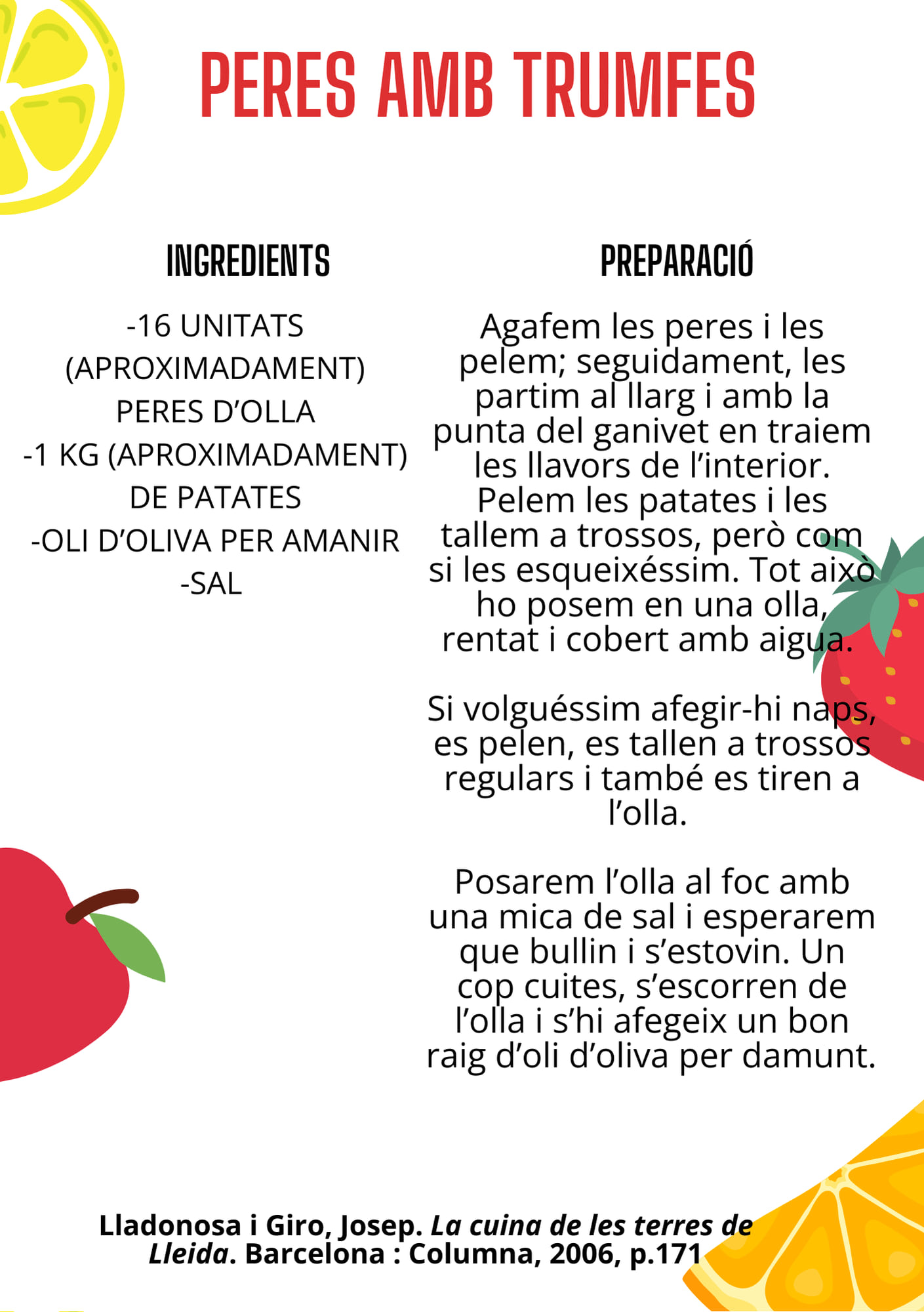 RECEPTES RECOMANADES: peres i hortalisses (pàg. 170-171), en les quals ens fa una descripció de dues tipologies de peres produïdes a comarques del Pirineu de Lleida especials per cuinar; oca amb peres (pàg. 342), així com de postres amb fruita seca i confitada.