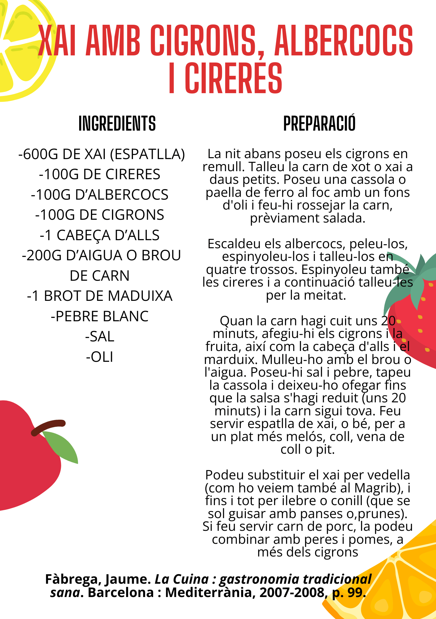 RECEPTA RECOMANADA: xai amb cigrons, albercocs i cireres (pàg. 99).