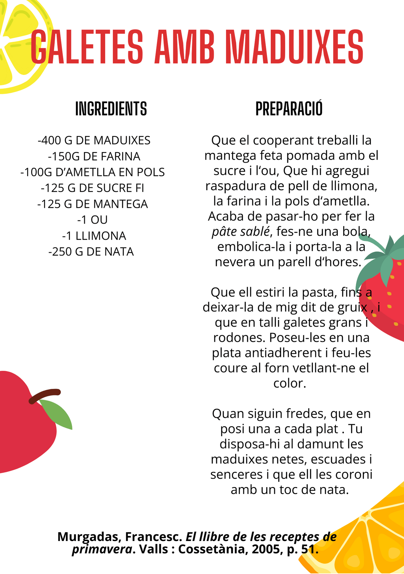 RECEPTES RECOMANADES: galetes amb maduixes (pàg. 51), macedònia amb merenga (pàg. 67), cuixa de xai amb peres (pàg. 91) i el sorbet de poma verda (pàg. 123).