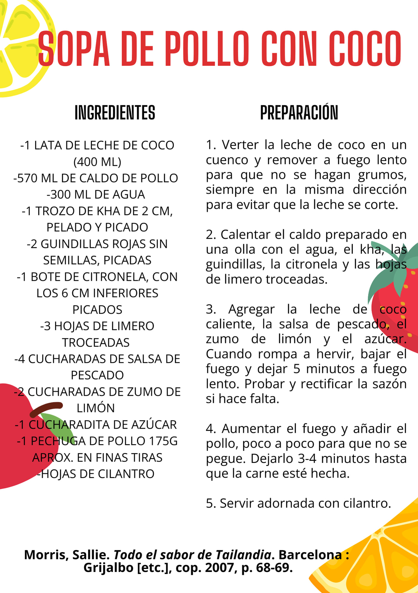 Delicadesa a parar taula. Hi trobem… cacauets per guarnir o com a ingredients de salses, i fruita verda en amanida com el mango verd i la llima. I el coco, tan present en aquesta cuina, de tal manera que la sopa de pollastre amb coco Tom Kha Gai (pàg. 68) és un dels plats més famosos del país.