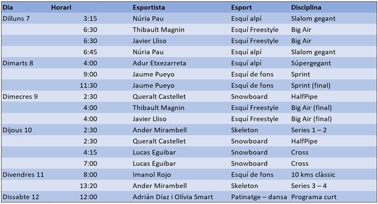 Però per aquells malalts d’esports que s’animin a posar-se el despertador, us deixem una graella amb els horaris dels esportistes espanyols i catalans que comencen les seves competicions aquesta setmana.