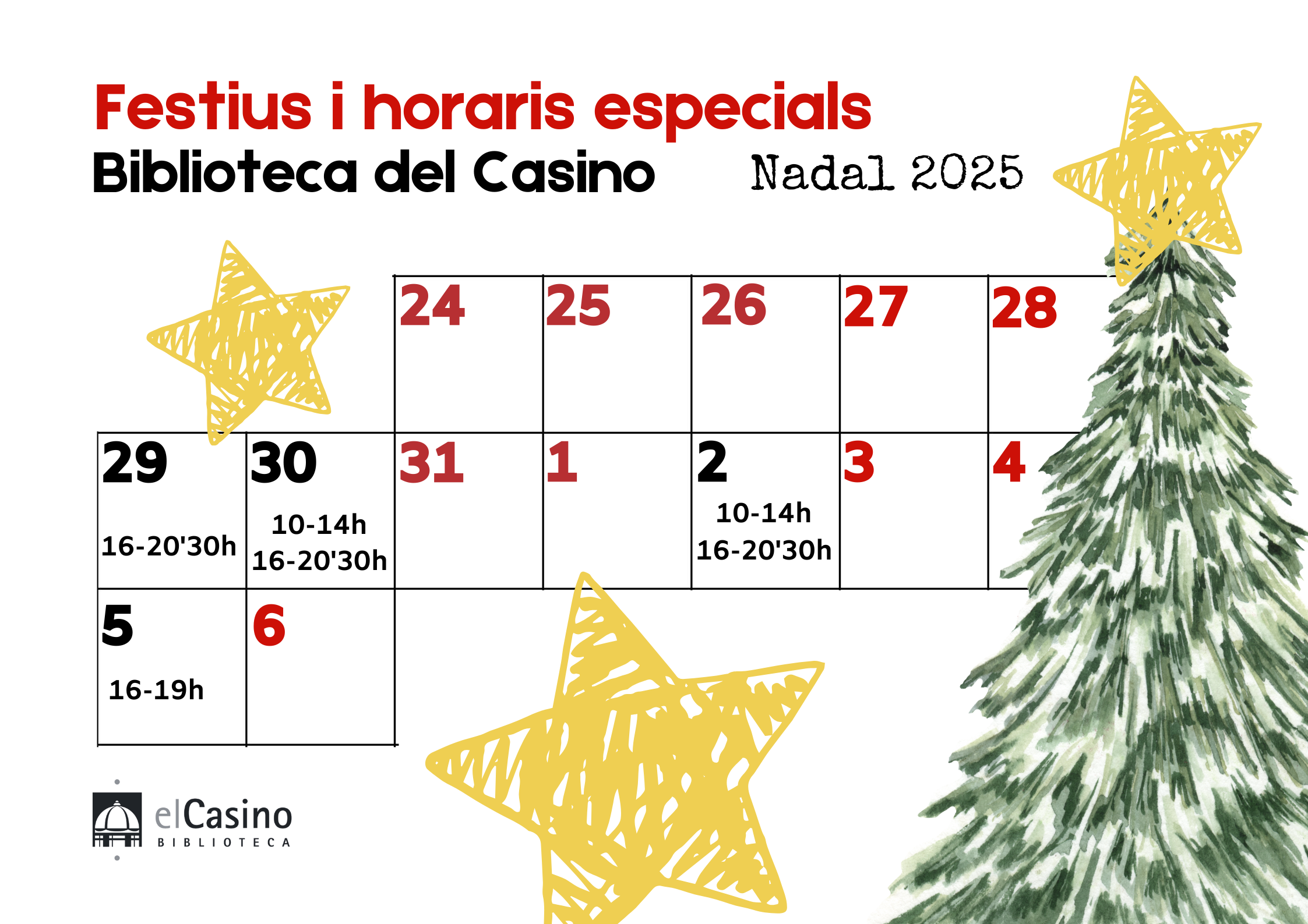 | L'horari d'hivern comença el dia: 16 de setembre Observacions de l'horari: Biblioteca tancada: 24 desembre, 27 desembre, 31 desembre, 3 gener Horaris especials: Del 30 de desembre al 5 de gener |