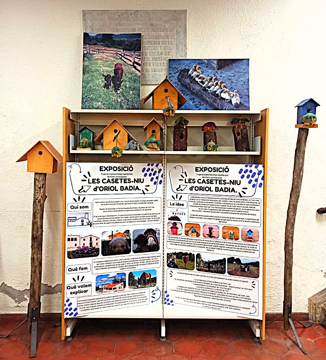 Les casetes-niu, construïdes al taller de fusteria del centre Oriol Badia, en el marc d'una col·laboració amb el Festival Batecs de Font-Rubí, estan repartides per les diferents plantes de la biblioteca. Cadascuna d'elles mostra detalladament, amb fotografies i textos explicatius, aquelles activitats que tenen un retorn positiu a la comunitat, és a dir, que contribueixen favorablement a la societat aportant valor afegit al conjunt de la població.