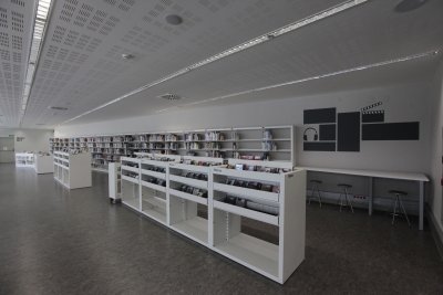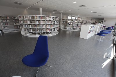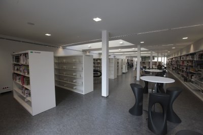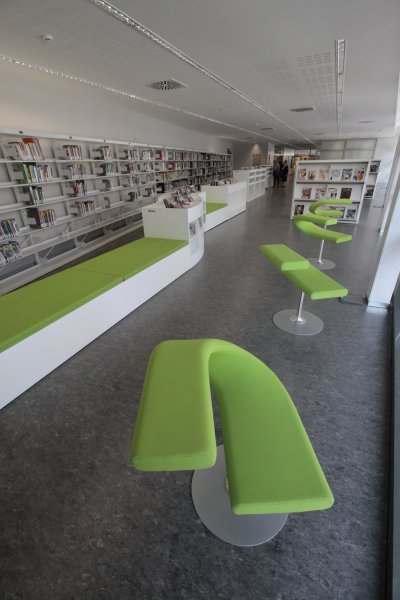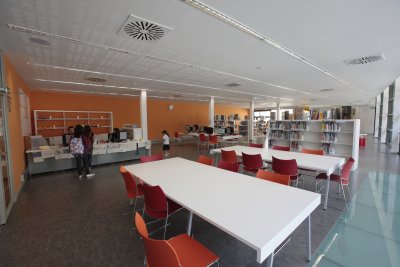 A la planta baixa s'ubiquen l'àrea infantil i l'àrea d'oci on podem trobar les publicacions periòdiques, audiovisuals i d'altres llibres com les guies de viatge o el nostre Racó Gastronòmic. A la primera planta hi trobem l'àrea de lectura amb les novel·les i tot el que està relacionat amb les llengües i la literatura, i l'àrea de coneixement, l'àrea d'informació i referència, la zona d'internet i una aula de suport equipada amb material multimèdia. A l'àrea de lectura també podem trobar una aula d'adults utilitzada com a sala d'estudi. A la planta soterrani hi trobem l'auditori amb capacitat per a més de 100 persones on es poden oferir tota mena d'activitats culturals i també hi trobem l'espai jove on els nois i noies a partir de 14 anys poden fer treballs en grup, utilitzar els ordinadors o la connexió a internet i socialitzar-se en un espai comunitari que permet un to de veu més alt.