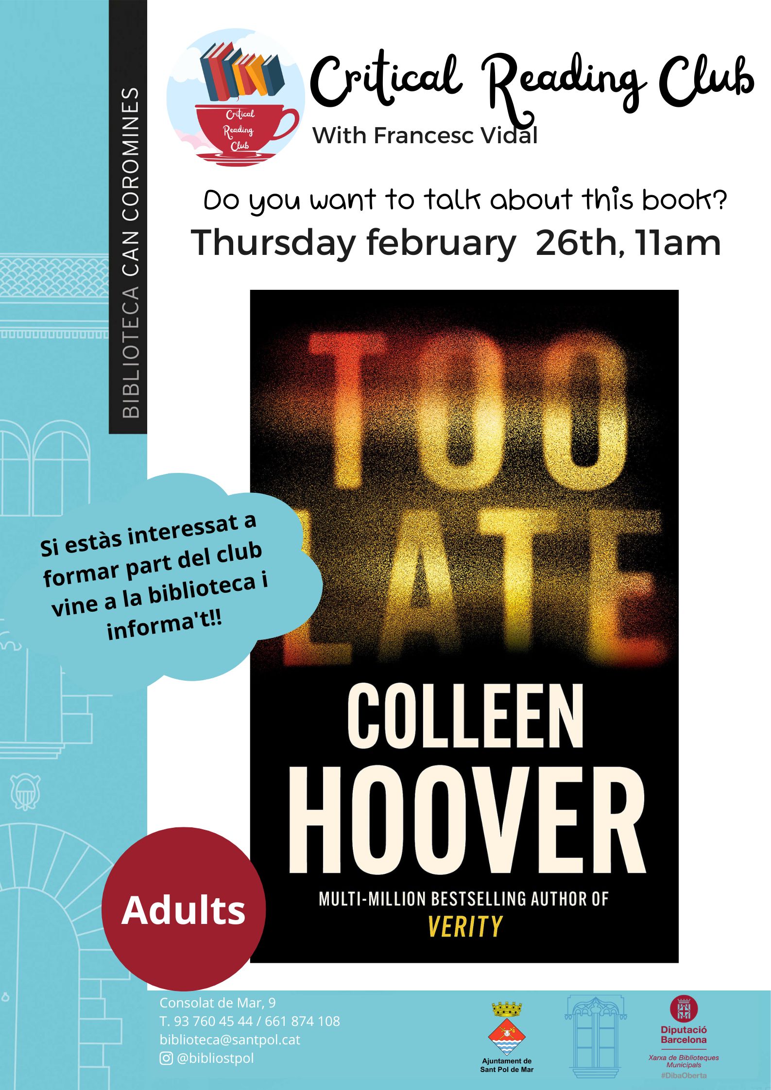 Too late de l'autor Colleen Hoover. Club a carrec de Francesc Vives