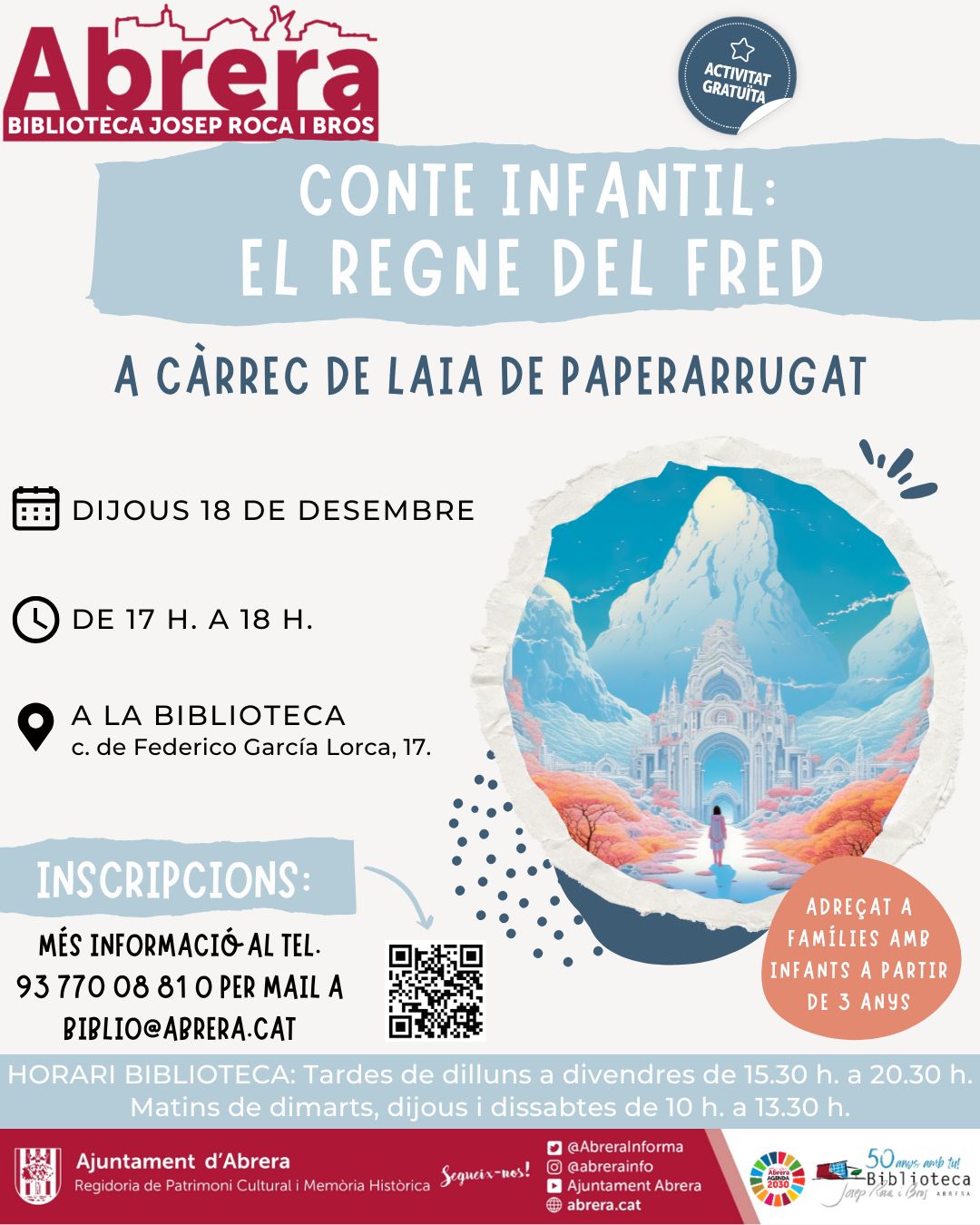 El Conte: "El regne del fred", a càrrec de Laia_contes de Paperrrugat, per a nens i nenes de totes les edats, així com les seves famílies. Es durà a terme a la Sala Infantil de la Biblioteca Josep Roca i Bros. La participació és gratuïta, però cal inscriure's prèviament a la biblioteca. La informació addicional es pot trobar a les xarxes socials de la biblioteca.