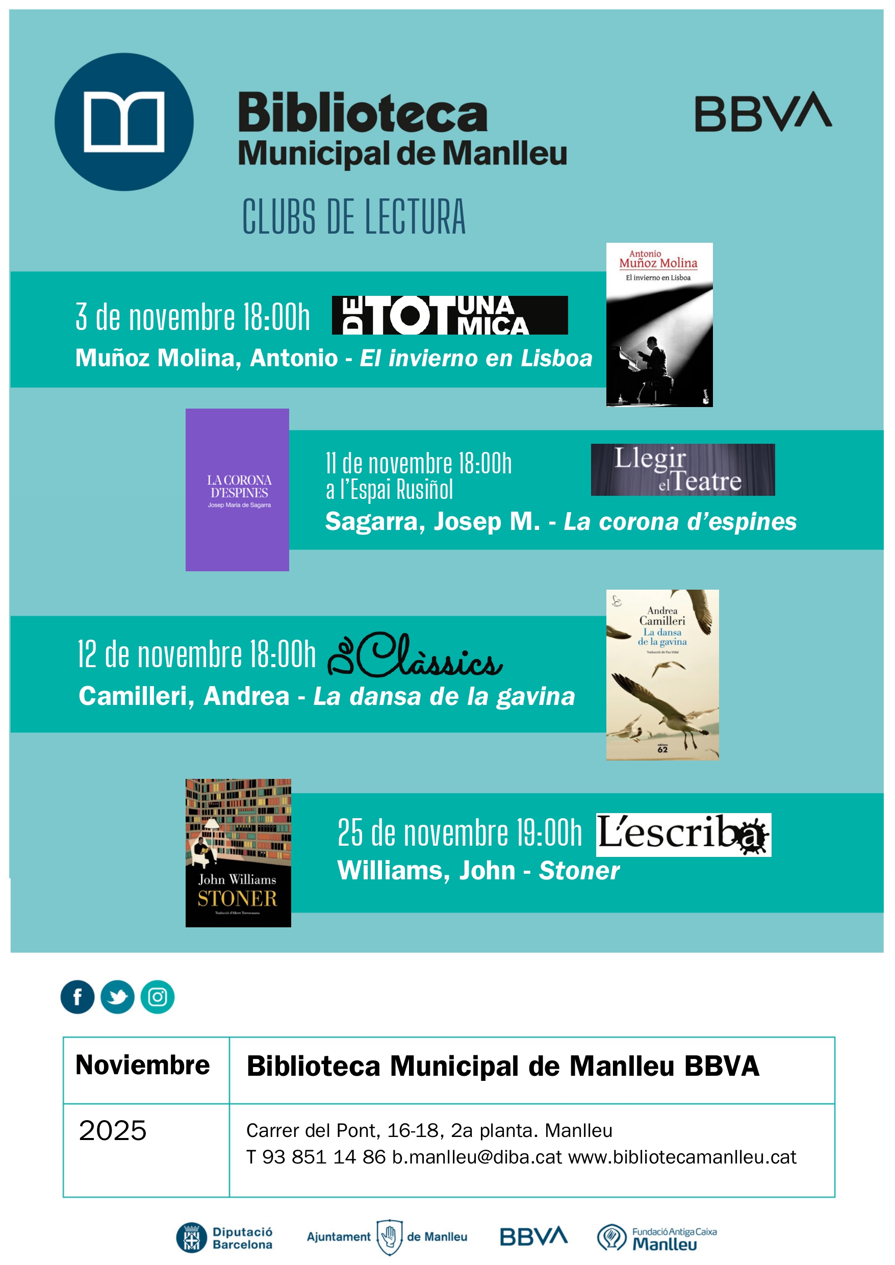 Club de lectura Llegir el Teatre. Amb la col·laboració de l’Associació Teatre Centre Manlleu. Conduït per Dolors Collell. Dimarts a les 18h.
