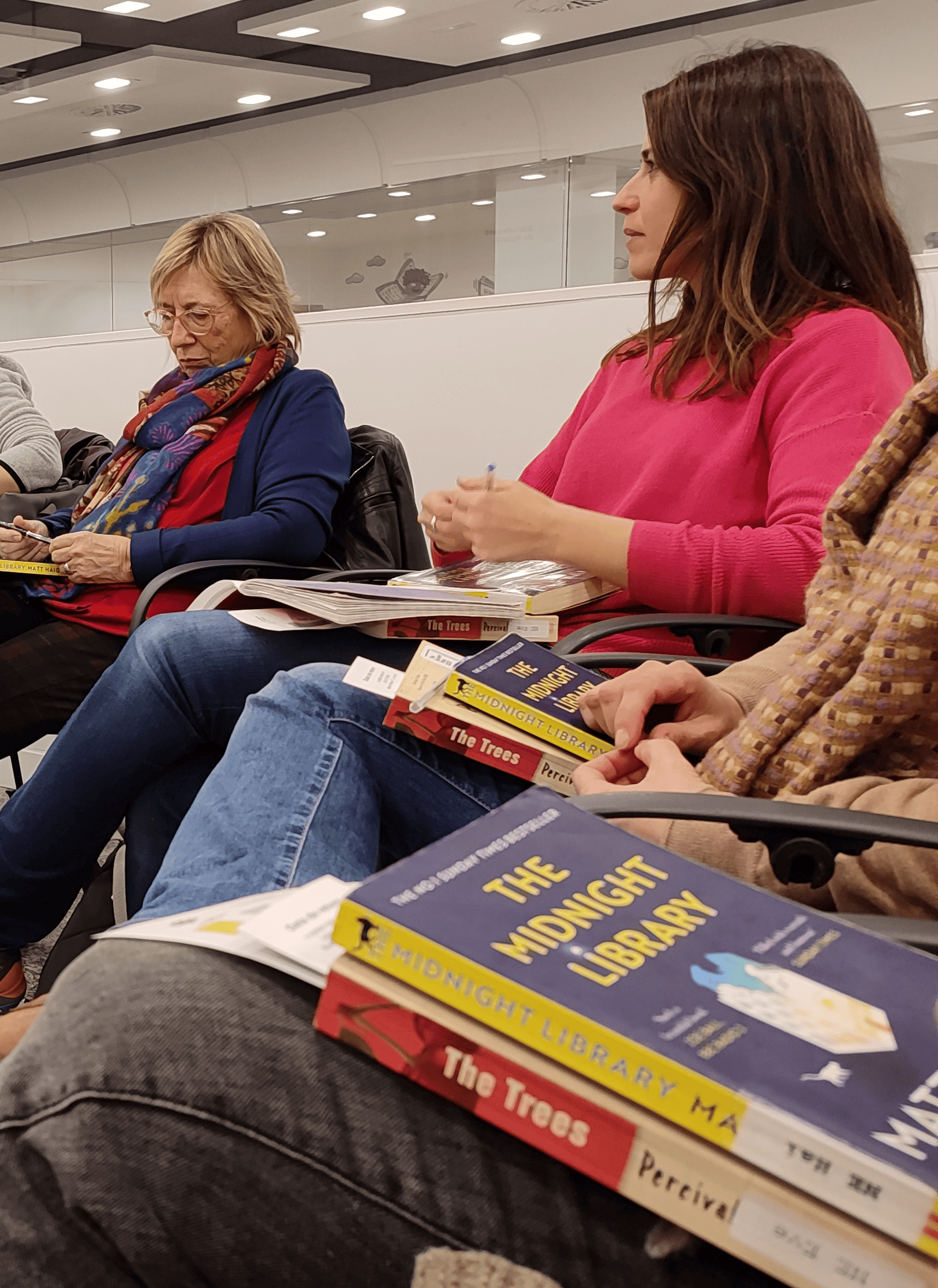 Cicle de tertúlies en anglès on es practica l'idioma a partir de la conversa informal sobre una lectura. Activitat dirigida a persones que tinguin coneixements d'anglès i vulguin adquirir més fluïdesa a l'hora de conversar en aquest idioma. Nivell mig-alt equivalent a un Nivell B1 (pot desenvolupar-se amb èxit en la majoria de situacions quotidianes i descriure experiències i desitjos, així com expressar la seva opinió sobre qüestions properes).