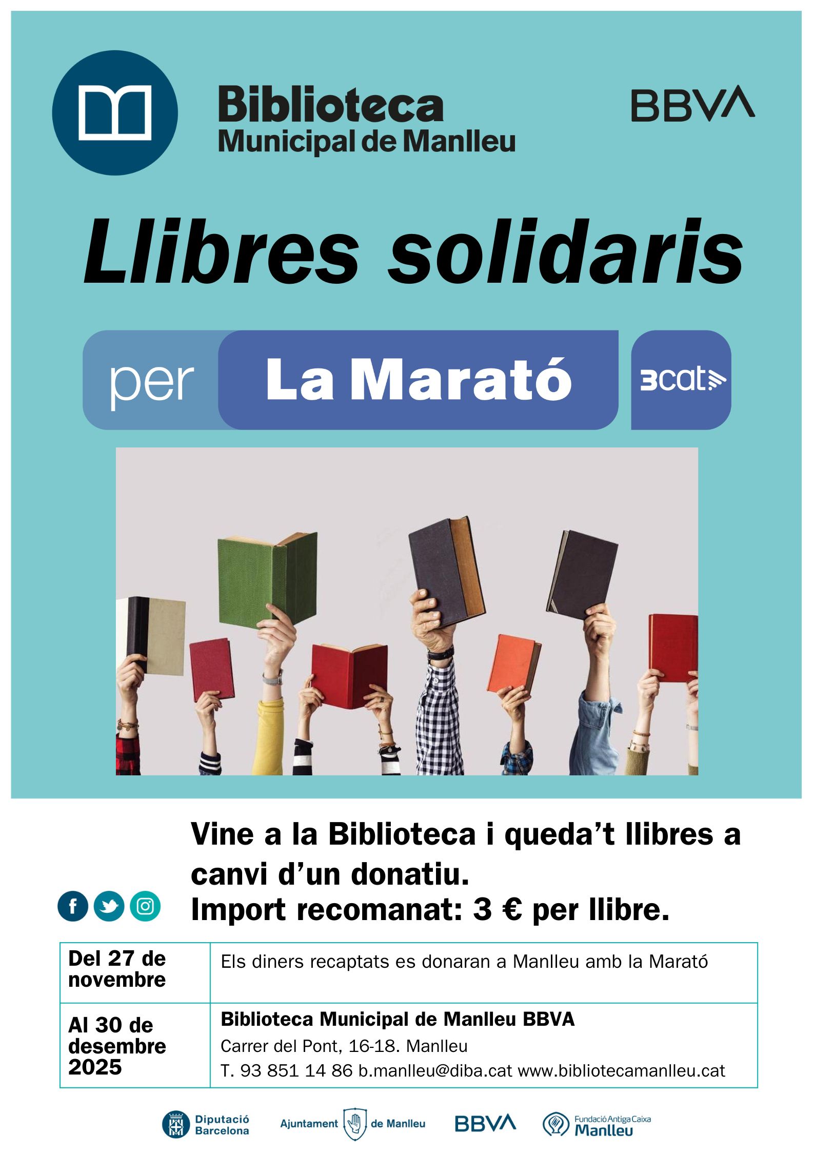 Un any més, tenim l'oportunitat de fer-nos amb llibres i, al mateix temps, col·laborar amb una bona causa! Vine a la Biblioteca Municipal de Manlleu entre el 27 de novembre i el 30 de desembre de 2025 i queda’t llibres a canvi d’un donatiu. Els diners recaptats es destinaran a la Marató de TV3.