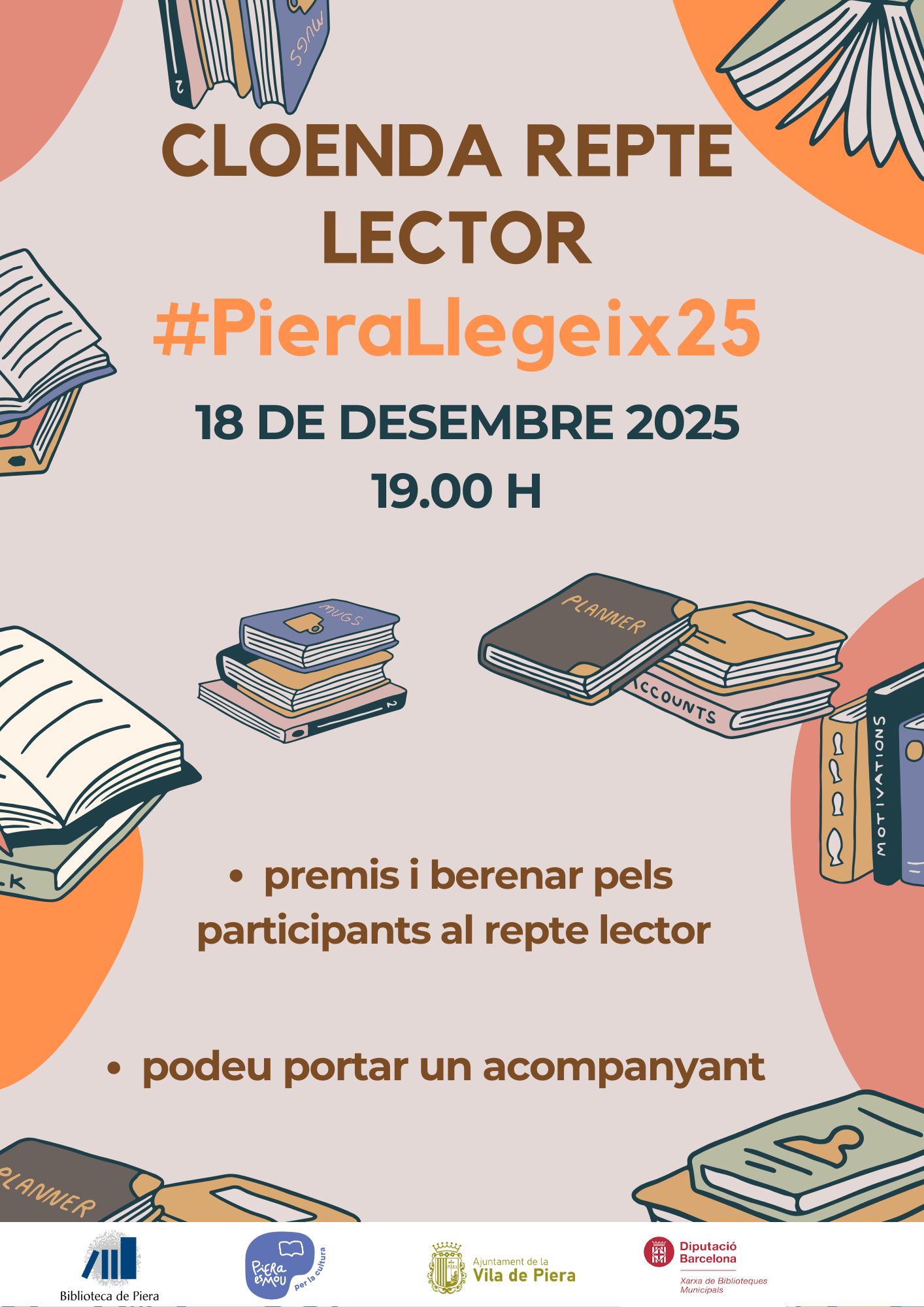 Cloenda del repte lector “Piera Llegeix”, en què durant nou mesos els participants han compartit lectures de gèneres molt diversos: novel·la negra, clàssica, poesia i narrativa local. Un acte per celebrar l’hàbit lector i reconèixer la constància dels lectors i lectores de la biblioteca.