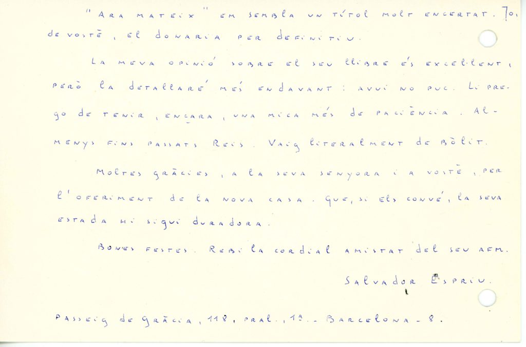 També hi ha correspondència amb les editorials, amb l’SGAE, sobre el Premi d’Honor de les Lletres catalanes, el Premi Nacional de Literatura o la seva candidatura al Nobel de Literatura. Així mateix es recullen cartes relatives a les felicitacions sobre el seu 70è aniversari i les mostres de condol per la seva mort.