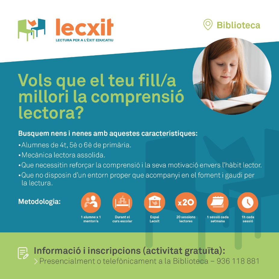 La Biblioteca reprèn el Programa LECXIT de la Fundació Bofill : lectura per a l'èxit educatiu. Amb l'inici de temporada, s'obre un període d'inscripcions per a infants lectors i adults acompanyants voluntaris.