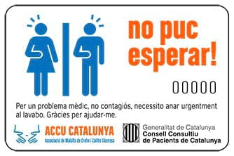 L'Associació de Malalts de Crohn i Colitis Ulcerosa de Catalunya (ACCU Catalunya) emet les targetes NO PUC ESPERAR! perquè aquests pacients les utilitzin, però són els metges de les Unitats MII i Serveis de l'Aparell Digestiu col·laboradors qui les lliuraran als seus pacients quan ho considerin necessari. No cal ser soci d'ACCU Catalunya per a rebre-la. Les targetes són gratuïtes i no són nominals, però estan numerades per a seguir un control de lliurament.