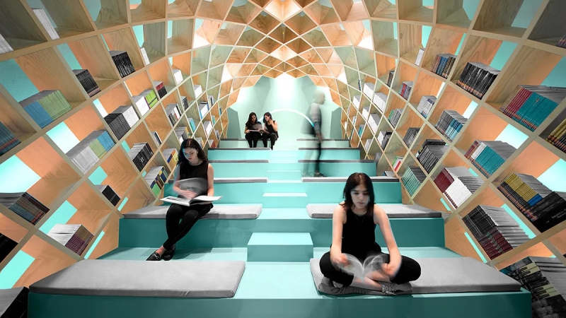 Ens movem de continent, per exemple a Àsia trobem biblioteques modernes i futuristes com la Biblioteca Pública de Tianjin Binhai (Xina) presidida per una gran esfera blanca anomenada “l’Ull”, centre d’exposicions i cor del recinte, envoltada de prestatgeries ondulades que imiten les corbes dels arrossars. I el seu contrast com la Biblioteca Pública de Beitou (Taiwan) qie és un autèntic oasi ecològic: construïda amb fusta i vidre, respira natura i tranquil·litat enmig de la ciutat, amb jardins a la teulada i un sistema sostenible de recollida d’aigües pluvials.