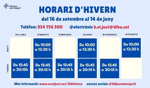 | L'horari d'estiu comença el dia: 15 de juny Observacions de l'horari: Horari d'estiu del 15 de juny al 15 de setembre. Biblioteca tancada els dies 23 i 24 de juny; i 11 de setembre. La biblioteca tanca per vacances d'estiu del 4 al 31 d'agost de 2025 (ambdós inclosos). | L'horari d'hivern comença el dia: 16 de setembre Observacions de l'horari: Horari d'hivern del 15 de setembre al 14 de juny. Biblioteca tancada els dies 1 de novembre, 6, 8, 25 i 26 desembre. Horari especial intensiu: Nadal (del 22 de desembre de 2025 al 6 de gener de 2026) i Setmana Santa (del 14 al 21 d'abril de 2025). |