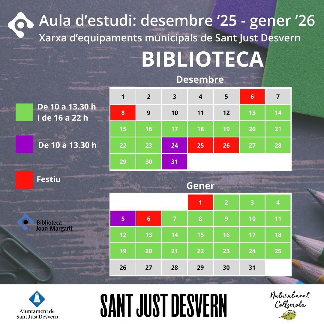 Horari d'hivern del 15 de setembre al 14 de juny. Biblioteca tancada els dies 1 de novembre, 6, 8, 25 i 26 desembre.